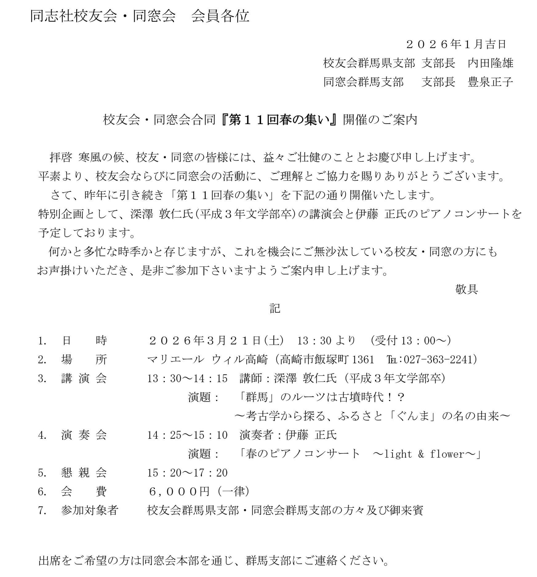 2025年は、春のつどいを3月8日(土)、総会懇親会を10月18日(土)マリエールウィル高崎にて開催の予定です。多くの皆さまのご参加を心よりお待ち申し上げます。
