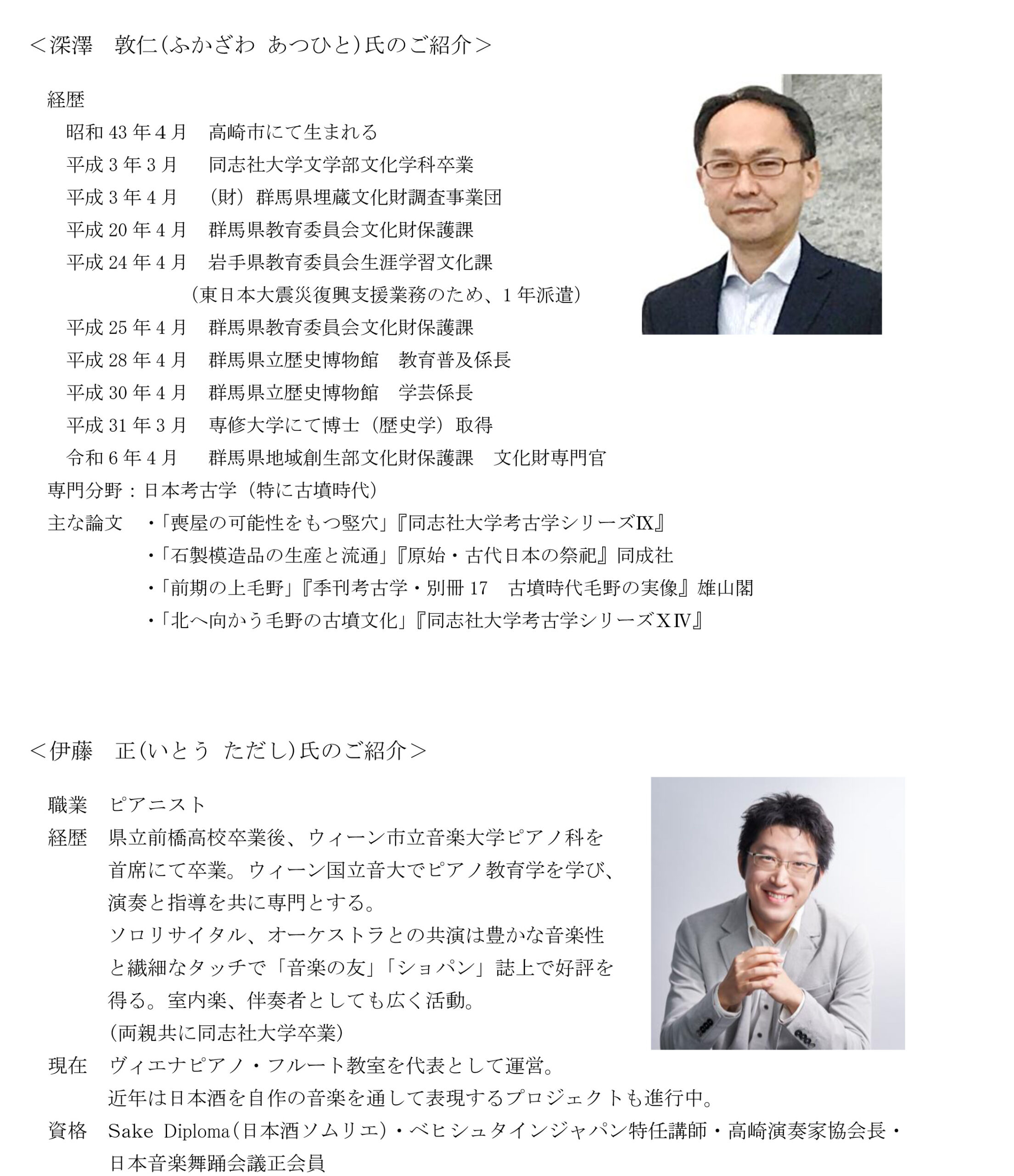 深澤敦仁氏(1991年同志社文学部卒)の「群馬」のルーツは古墳時代!?~考古学から探る、ふるさと「ぐんま」の名の由来~という、群馬在住の参加者にはとても興味深い内容の講演会と、伊藤正氏(ご両親が同志社卒・ピアニストで日本酒ソムリエ)のピアノコンサート&群馬のお酒の話があり、その後、懇親会が行われました。