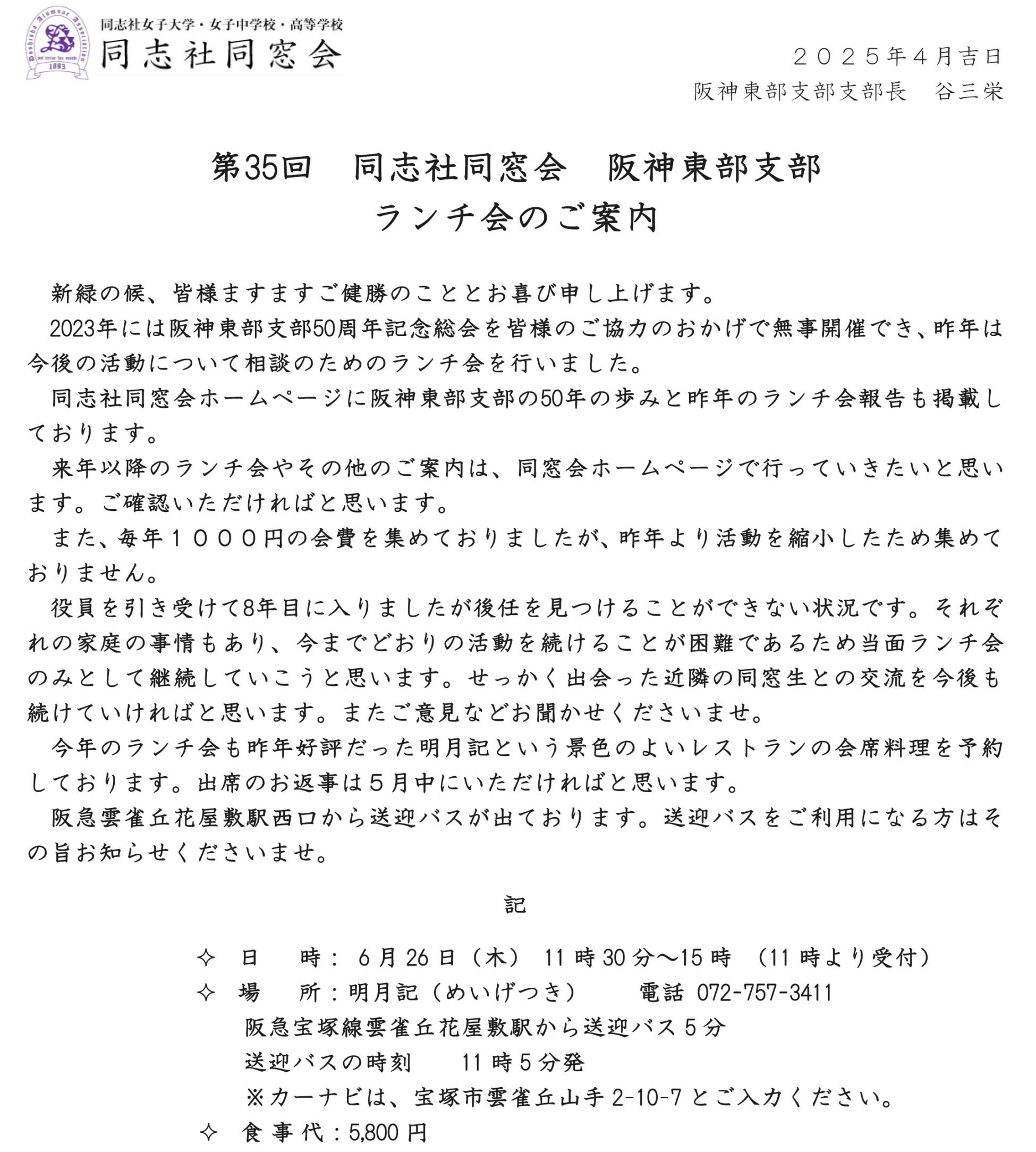 また、個別にご案内、詳細などをお知りになりたい方は 同志社同窓会本部 にご連絡いただければ、阪神東部支部から直接ご案内いたします。