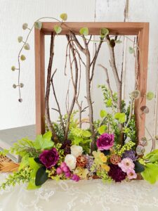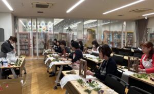 同志社カラーを基調とした紫の花々を散りばめたアート作品の制作を企画いたしました。参加者はそれぞれ自由な発想で、思い思いの作品を完成させました。その後は京都にある有名な一保堂のお抹茶を点て、全員でいただきました。