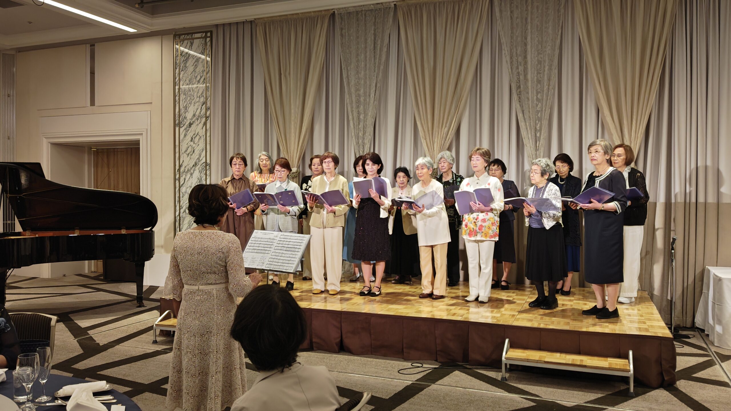 讃美歌会アリッサムの素敵な歌声を楽しみ、その後おいしい食事を頂きました。食後、観世流能楽師大西礼久先生をお招きし、能楽の中の女性をテーマに面(おもて)・衣装をお持ちいただき説明していただきました。少しだけ能楽を楽しんでもらえたと思います。